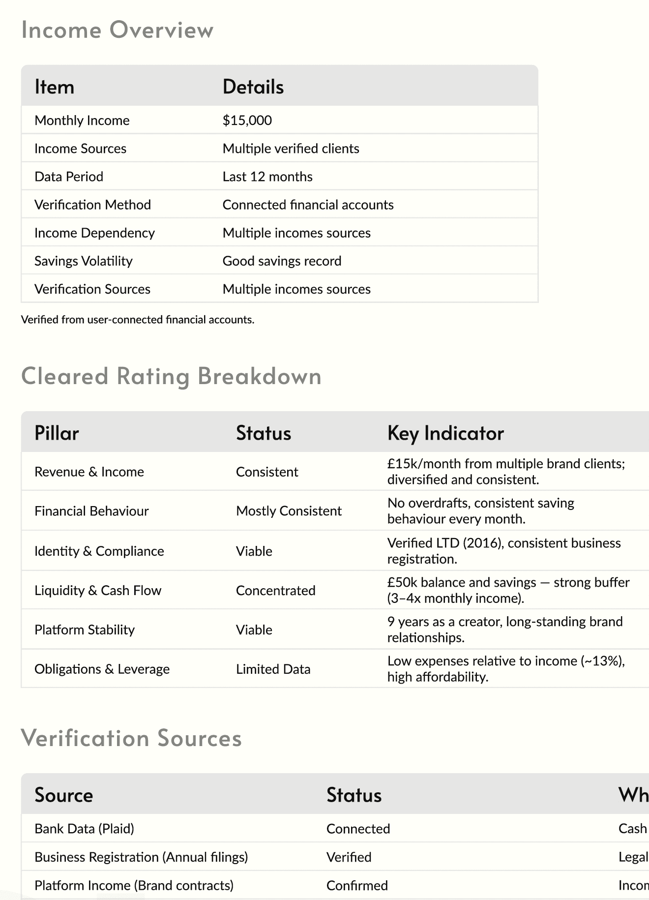 Step 2: Cleared Generates We normalize fragmented income and produce a verified report. Institution-ready. One standard.